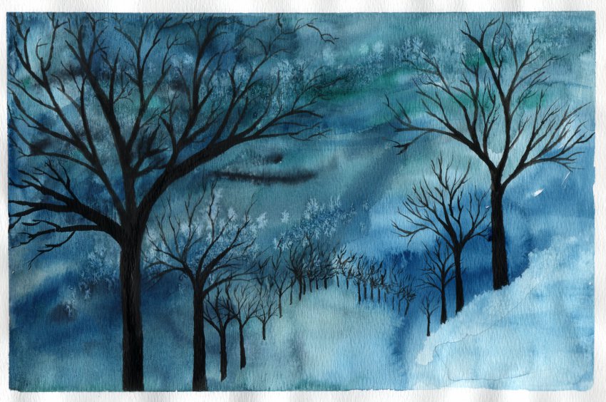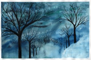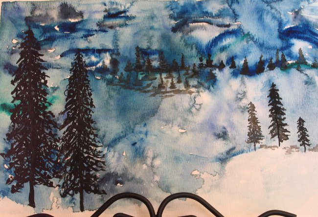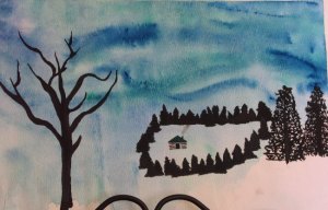 Our first piece of art was a watercolour snow-scape with silhouetted trees. The first step was to create the background which was a combination of snow and sky. We wet the whole paper and used different blues with a little black to make a swirly, abstract sky, leaving some areas white to suggest snow. While that was drying we practiced drawing winter trees, either bare deciduous or different kinds of conifers. The next week we added silhouettes of trees to our snowscapes.