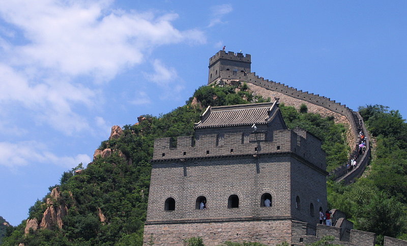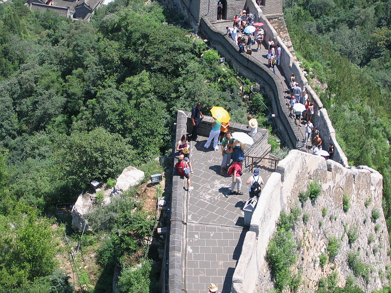 Then we climbed!  The steps are very steep and the sun was very warm so it wasn’t long before the group divided into smaller groups:  the serious, the deadly serious and not quite so serious.  Which ever group you were in it was still a thrill to be on the wall and see what a massive task it must have been to construct it.  I was a mildly serious climber going only as far as I could on the limited sleep I had had at that point.  All the surrounding hills were covered in different tress, some of them planted in formation creating a green tapestry on all sides.  The wall itself snaked off in two directions over hills and out of sight.