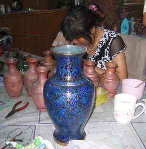 After our trip to the Great Wall we stopped off at a Cloisonne Factory and were able to see each step involved in creating the beautiful pieces made using this technique.  Each item is made from copper onto which is marked an elaborate design.  The craftsman then attaches wire to the item along the lines of the design making compartments into which coloured enamel will be dropped. The item is heated and the enamel process repeated until there is enough to fill each compartment.  Each item is fired, polished and then gilded along the original wire lines.  As you can see the process is time consuming and the prices reflect that.  We had a chance to try dropping colour into the compartments on copper saucers and quickly saw that a steady hand and an accurate eye was needed.