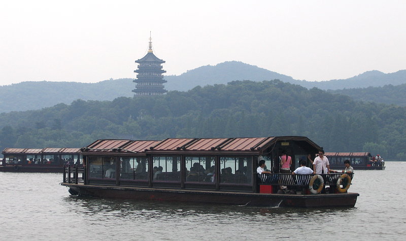 It was hot and hazy as it was most days in China, but we did have the option of staying inside the airconditioned area.  To see the scenery though, you needed to be outside.  We saw many other barges like ours and on the shore and the islands we could see small and large pagodas.  After the ride was over we wandered through the park and admired the gardens, fish and peacocks.  What we really wanted to see though was the popsicle stand, which we found before boarding the bus and heading off to Longjing Tea plantation, where Dragon Well tea is made.