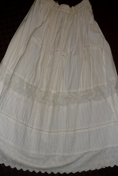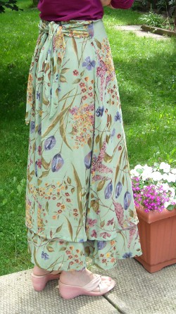 So far this year I have turned one dress into a skirt. The dress was one I bought in Melbourne while shopping with my dear friend Alexandra. She convinced me to step out of my comfort zone and buy a green dress, a change from the blue I usually wore. I bought it from Monsoon, which was for a long time my favourite clothing store. Fortunately they had very impressive sales twice a year otherwise I could never have bought anything there. I realized too late that I should have taken a “before” shot, so I could post it beside the after. L15 was not impressed when she saw that I planned to cut up the dress, she thought it was much prettier the way it was. She was probably right but I felt I would wear it more as a skirt and it would fit me better. Just after I converted it I was given a “hand me down” blouse which matches beautifully. Hand me downs are totally acceptable in this diet, in fact they are encouraged.