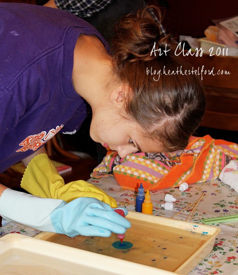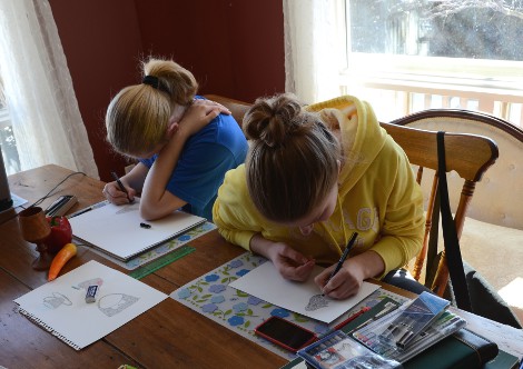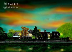 After completing our faces unit each of the three girls in the class embarked on a project of their own choice to be entered in the Young at Art competition held by the City of Ottawa. The competition is open to 12-19 yearolds. A14 chose to do some digital art using the Bamboo we gave her for Christmas. She took a photograph of the canal in winter, desaturated it and turned it into a spring or summer scene at dusk.