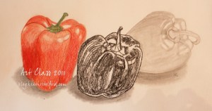 H13 tried several ideas before settling on one of the projects we had done in class: capsicums drawn using charcoal, watercolour pencil and graphite pencil.