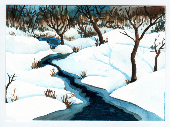 The decision to put up each of your works as you finish them is a brave one, but a good one. It will provide an easy opportunity for both you and your viewers to see how you are progressing and particularly to note what are the continuity threads in style and subject. For example, I see the darkening colours of autumn in your first painting has now moved to the depth of the snow drifts in the recent one. I also note that not having touched the brushes and paint for some time, you are quickly becoming familiar with it again.